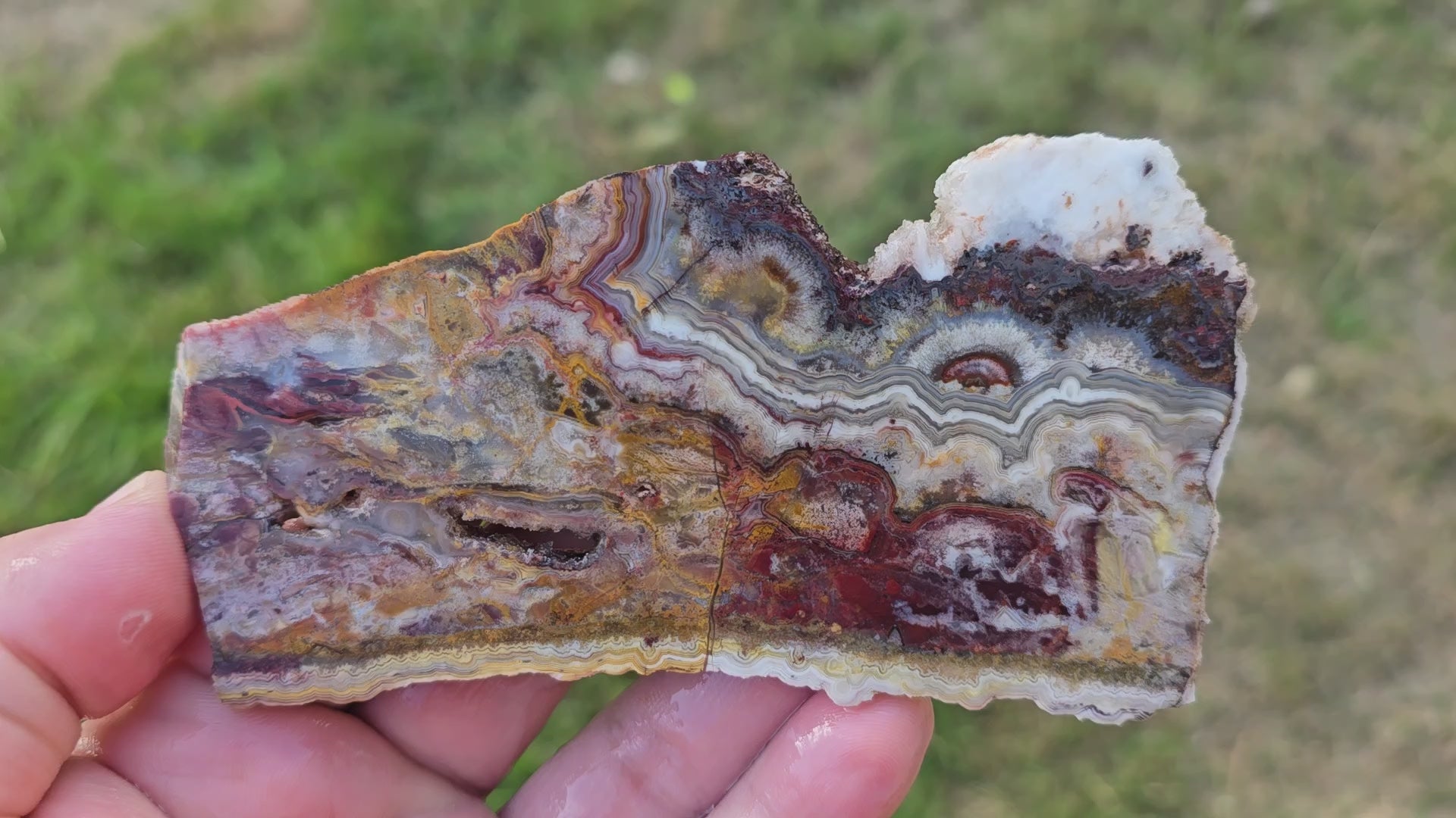 This slab displays an interesting contrast of red versus orange coloration separated by a hairline fracture down the middle, creating a natural yin-yang effect along the same pattern lines. This would make a remarkably unique cabochon. It also features a neat druzy pocket that appears to be smoky quartz, adding natural character.