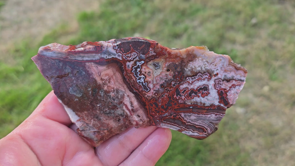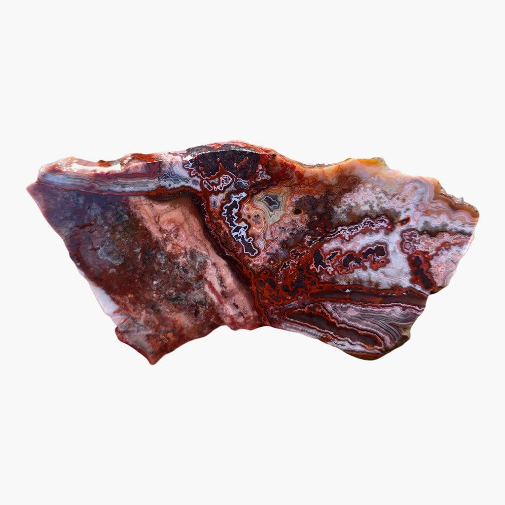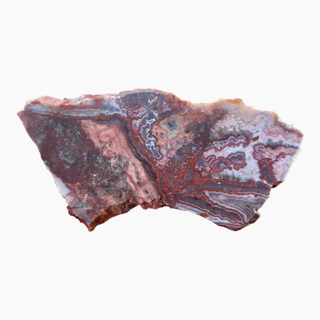 Laguna Lace Agate is a variety of Mexican lace that often has dominant red present with attractive, well-defined lace patterns throughout. It tends to be quite solid, with most deposits never having been blasted, preserving natural quality. It makes excellent cabs and is one of the most popular lace varieties on the market for good reason.