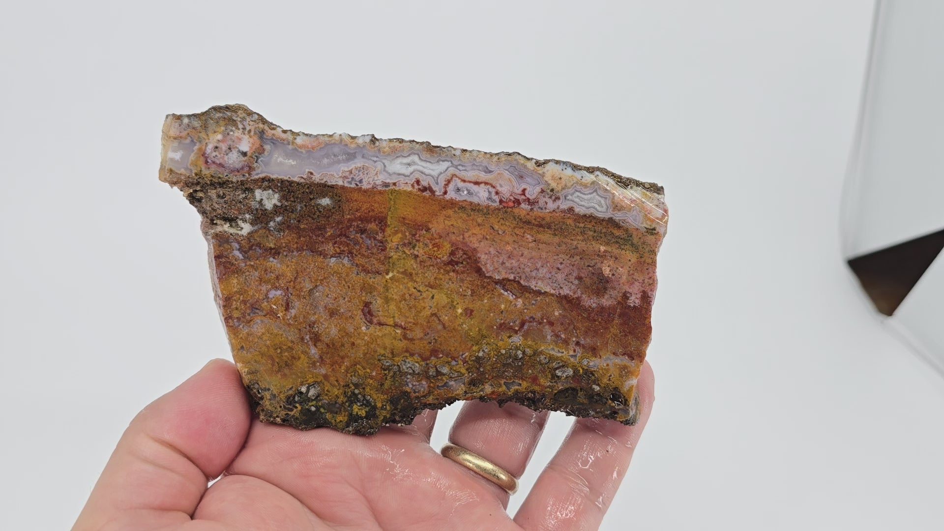 This piece features dual variety characteristics with both static moss and fortification banding. The feldspar inclusions add unique geological interest.