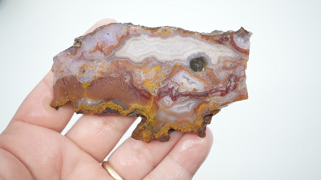 This gorgeous slab showcases the fantastic fortification, purple colorings, and moss agate that make Agua Nueva so desirable – all combined in one exceptional piece. Some fortifications feature small drusy pockets that could create unique natural sparkle in cabochons. This represents the full range of what this increasingly scarce material can produce.