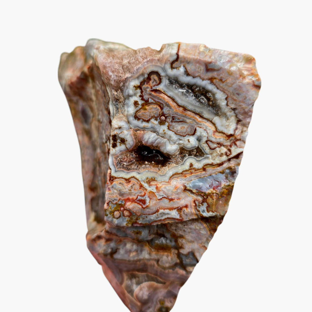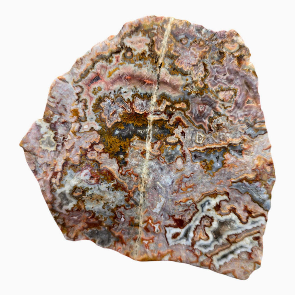 Apple Valley Agate is a material from the Sahara Desert that is collected by sheep herding nomads. This interesting agate comes with loads of variety, with just about every piece being unique. It can have pseudomorphic tubes, gorgeous moss with a huge range of colors, picturesque patterns, plumes, poppies, red, green, orange, blue, purple, and pink. It is one of my personal favorites to cut, and while hardness can differ from chunk to chunk, it generally takes a gorgeous polish and works into some designer grade cabochons.