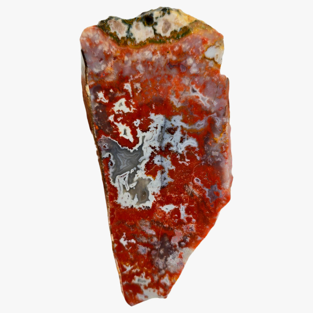 This piece features clean red moss formations framed by white fortification banding. The high contrast creates excellent cabochon potential.