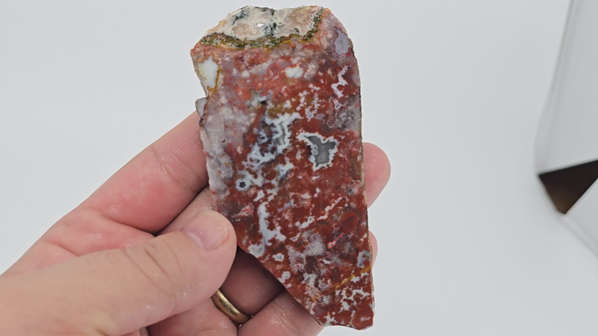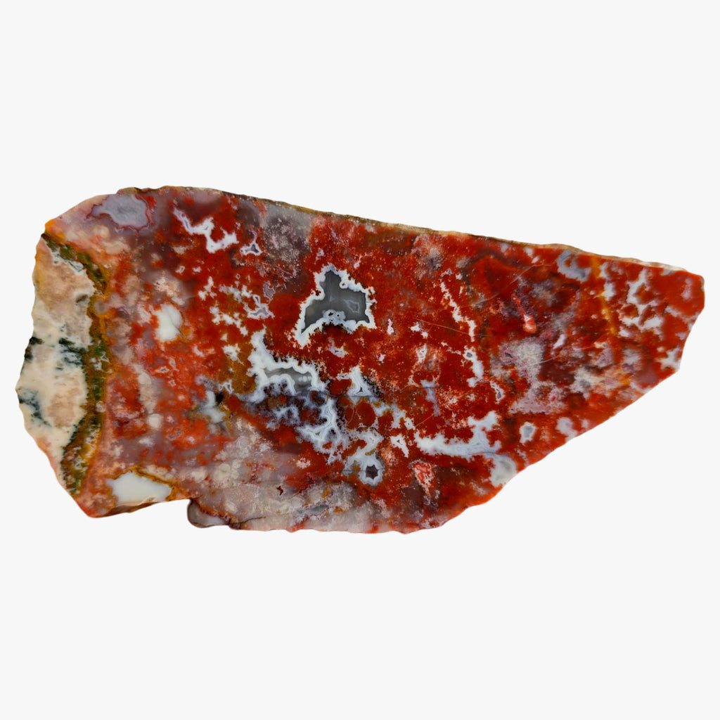 This neat red-based Apple Valley agate shows neat moss with white outlined fortification creating clean contrast. This one has great cabbing potential for quality finished pieces.