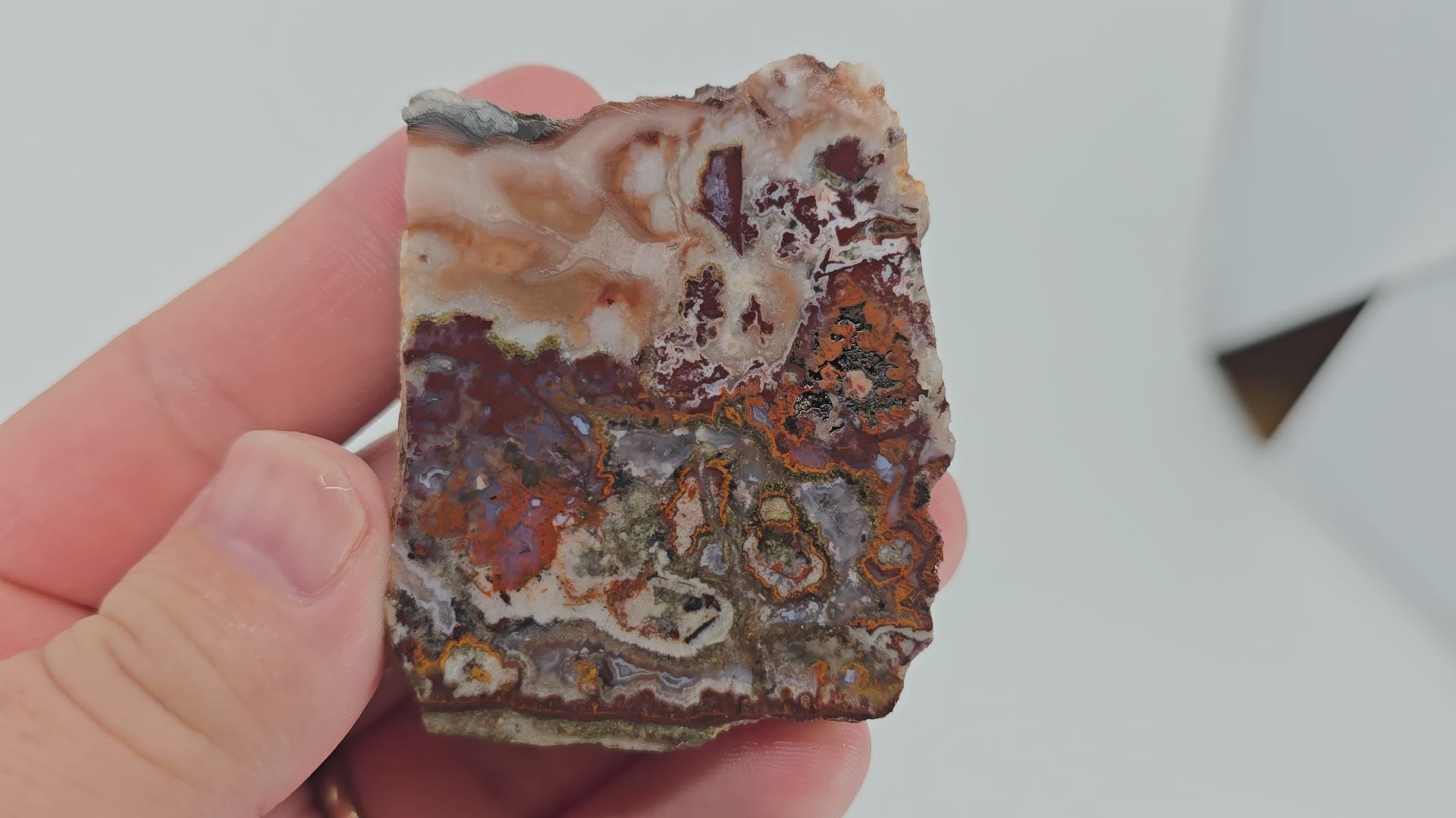 This one cab slab of Apple Valley agate shows red jasper-like material mixed with white and peach creamy agate creating attractive contrast for a single quality cabochon.