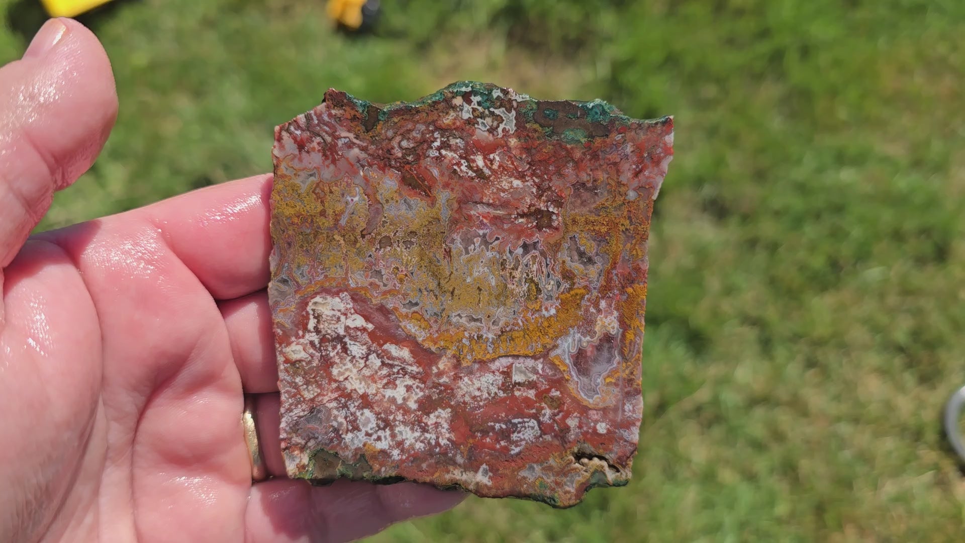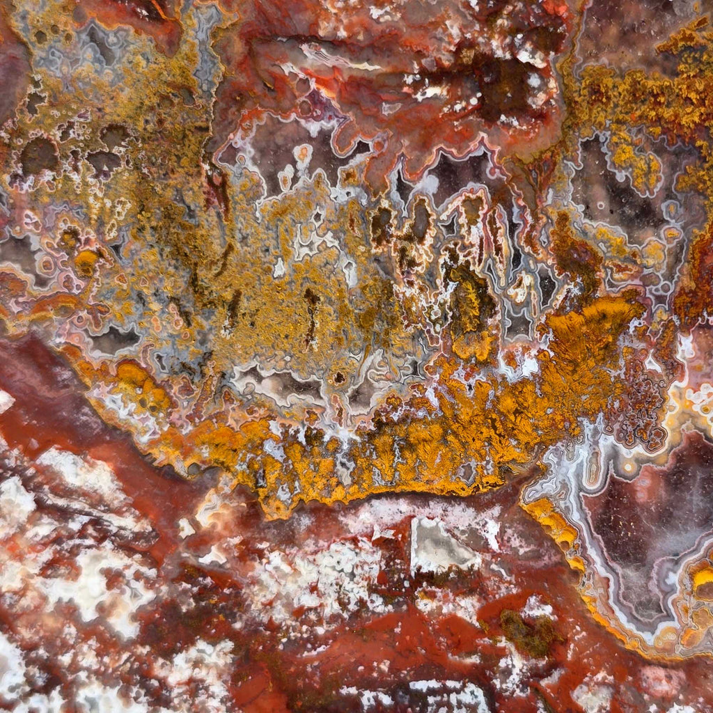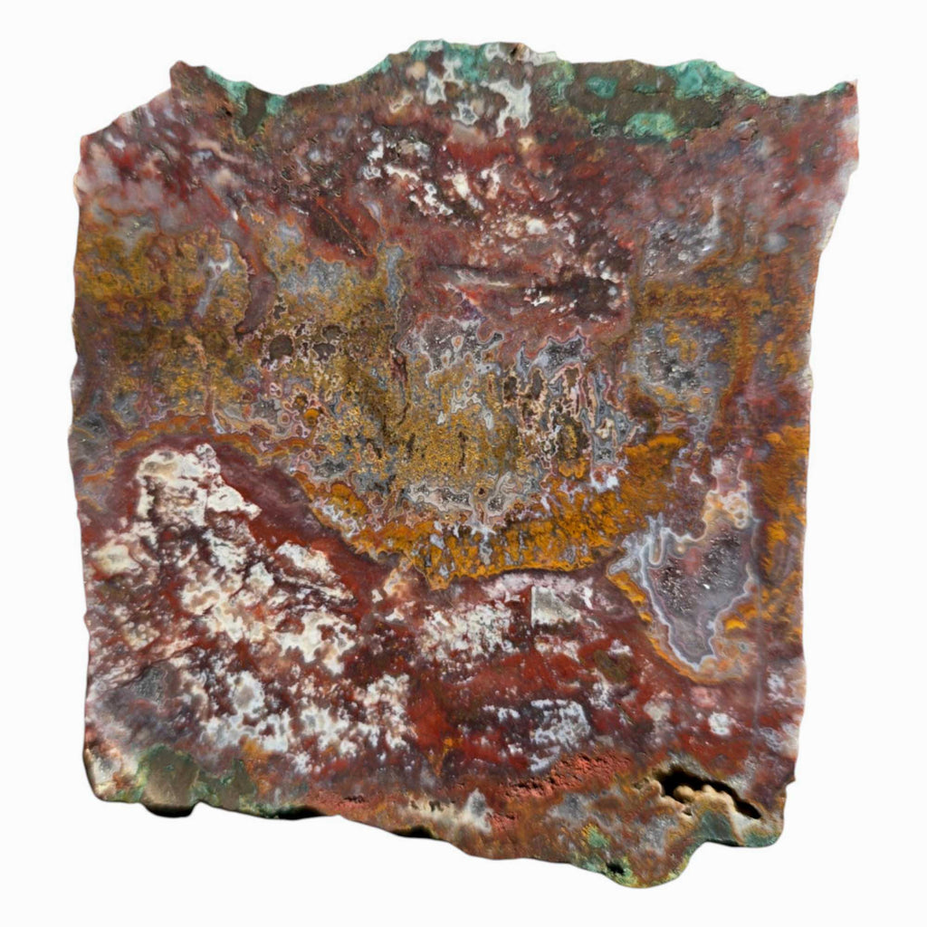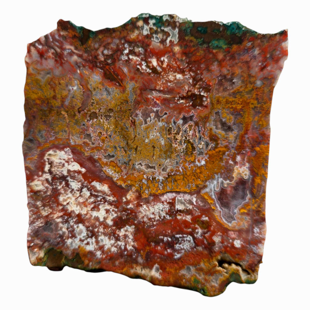 This Apple Valley Agate slab packs a little bit of everything—classic moss, festive Christmas-style patterns, delicate light fortifications, and even quartz druzy crystal inclusions. It’s a showcase of the diversity this material is known for, and whether you're cutting cabs or displaying it as-is, this piece is full of eye-catching features.