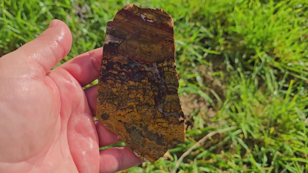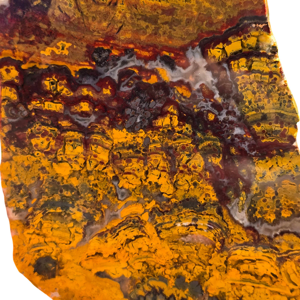 This gorgeous slab of Apple Valley Jasper displays beautiful Hematite flowers with the classic stromatolite pattern this material is known for. Featuring a ton of detail with oolitic-like patterns, this piece would make an impressive display or cut into exceptional high-end cabochons.