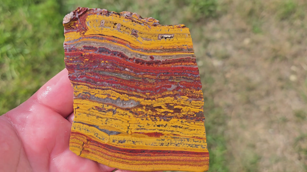 WHAT MAKES IT SPECIAL This piece displays vibrant red with striking creamy gold inclusions creating an artistic paint stroke effect. The quartz inclusions and broken patterns add depth and visual interest, perfect for unique designer cabochons.