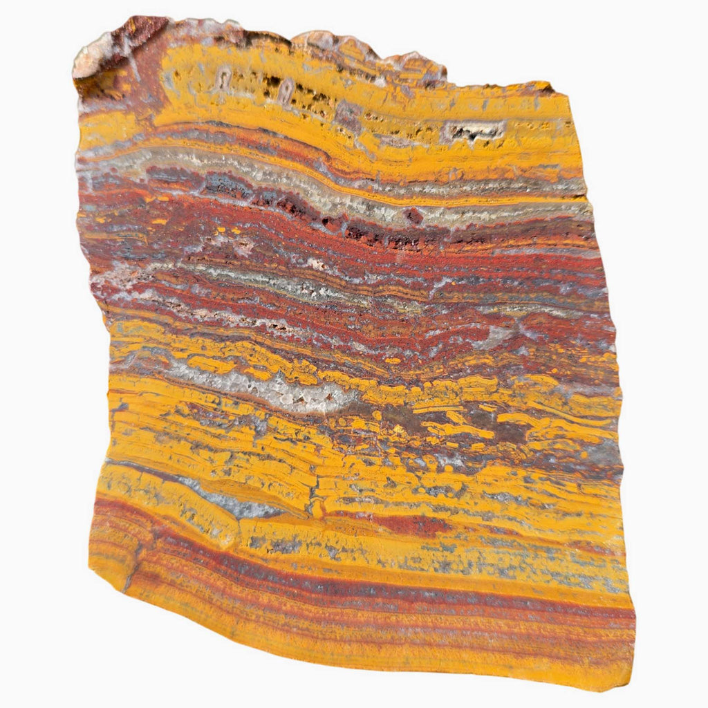 Fantastic bright red with creamy gold broken patterns and quartz inclusions create a paint stroke appearance in this Apple Valley Jasper slab. This Sahara stromatolite fossil features dramatic color contrasts that should work into defining cabochons for statement jewelry.