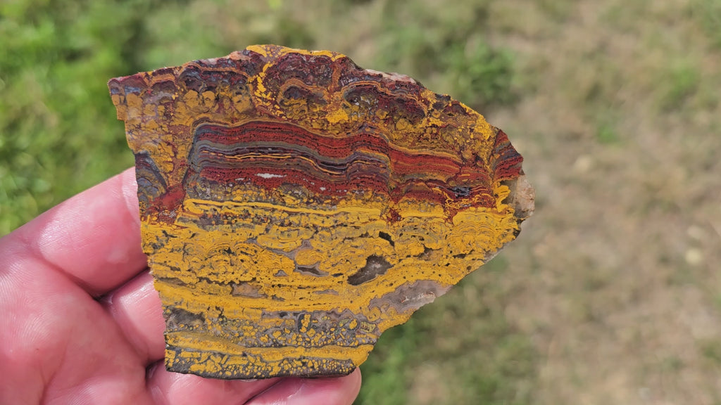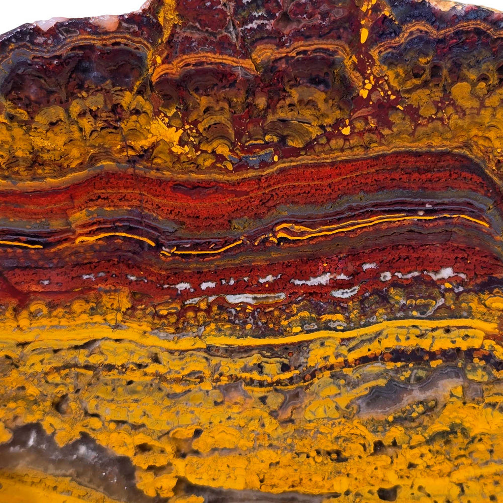 Great wavy reds with oolitic dotted jasper and hematite flowers along the top create visual interest in this Apple Valley slab. This Sahara stromatolite fossil features the distinctive patterns and colors that make this billion-year-old material perfect for unique cabochons.