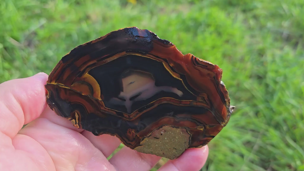 This gorgeous slab of Brazilian Piranha agate showcases black agate with orange and red banding that creates stunning contrast. This is a stunning slab that would be perfect polished as a display piece - it's going to be a standout specimen especially once polished.