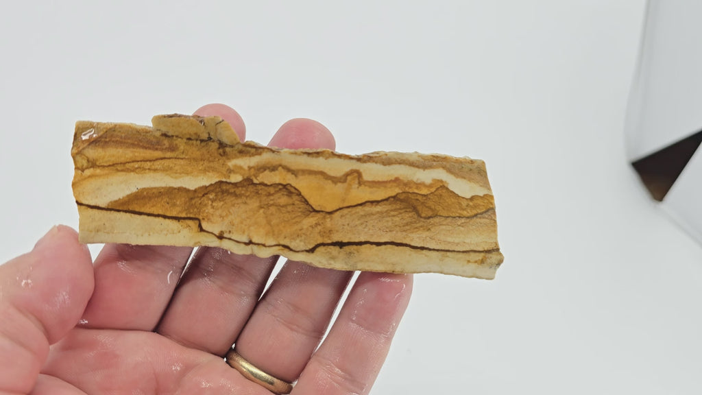 This piece displays scenic picture jasper qualities with rolling hills and mountain formations. As vintage old stock, this represents irreplaceable Oregon heritage from a depleted deposit.