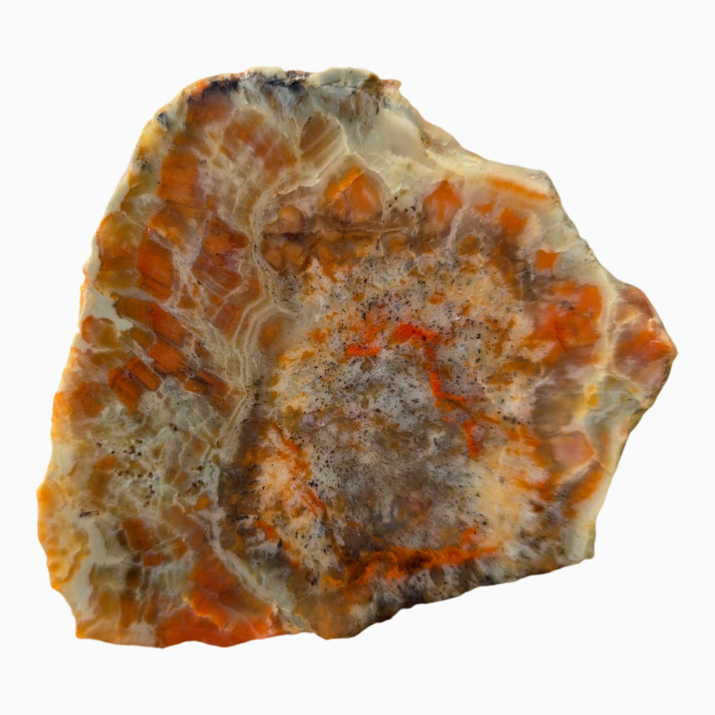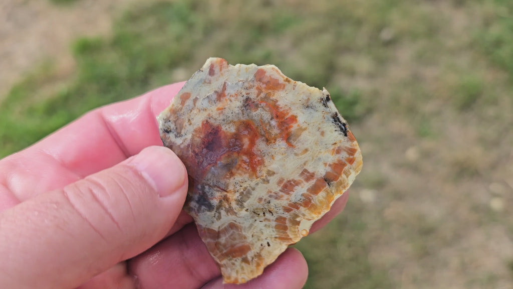 This neat little slab displays classic coprolite patterns with nice red splotches and bubblegum pink areas. Feldspar flashes add sparkle effect for creative design-grade cabochons. The natural shape leaves interpretation to imagination.