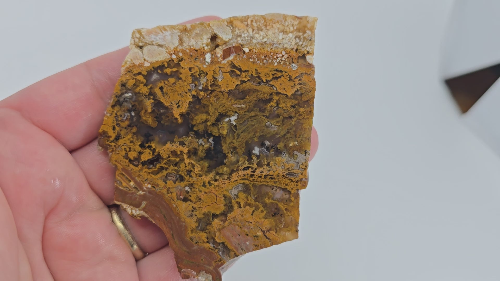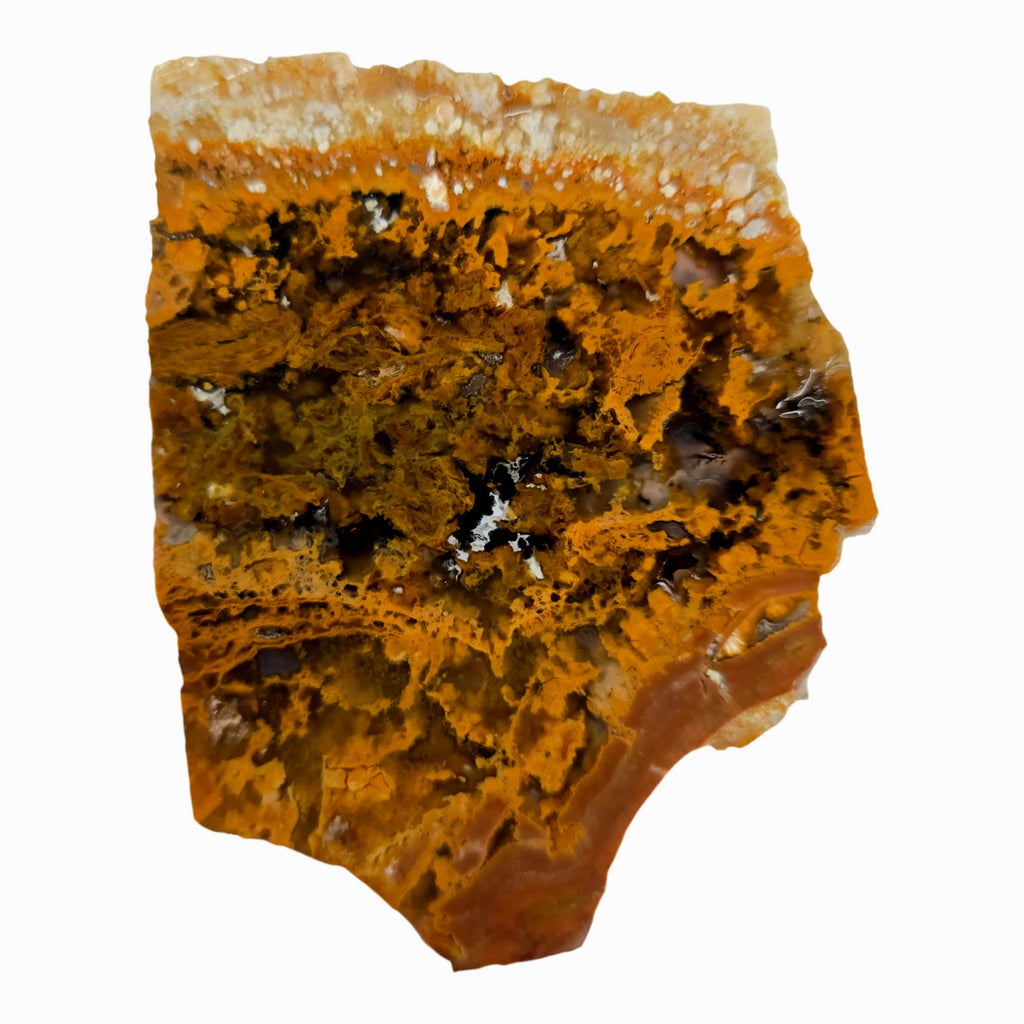 This excellent slab of Eagle Rock Plume Agate displays iconic golden moss against a black agate background. It also features a layer of rhyolite and a layer of white moss agate, creating multiple zones of interest. The well-defined areas and detailed patterns will make some really neat cabochons.