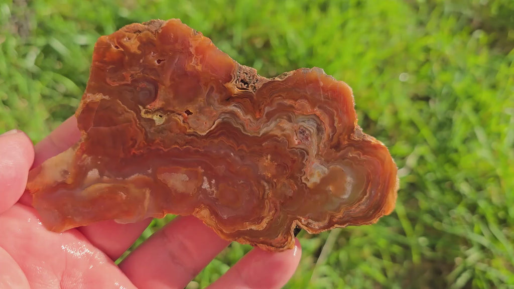 Fire Horizon is an impressive new lace agate from Mexico featuring bright fiery orange coloration and sometimes has a cloudy bubble-like formation to balance it out. This material can have occasional pits, but it's overall a very impressive stone and appears it should take a quality polish.