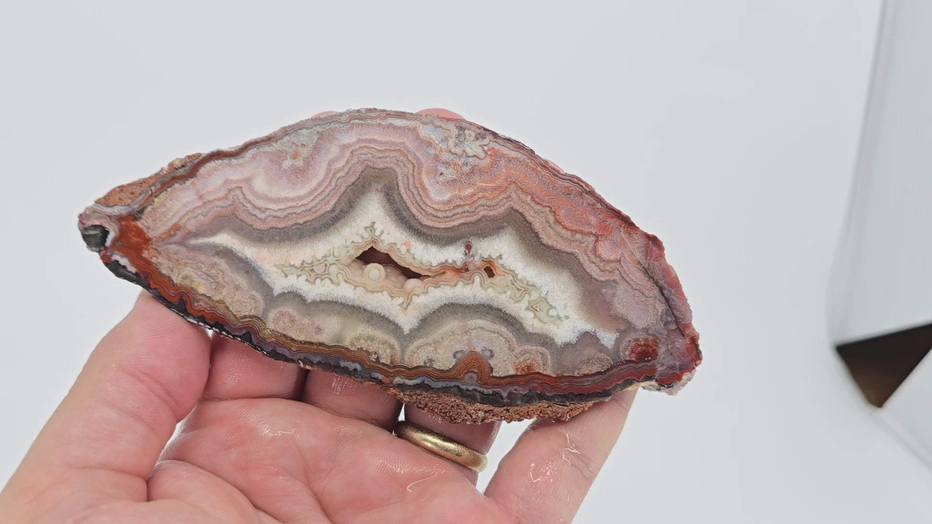 This high-grade slab of this now depleted material shows the great peach-colored lace around a drusy inclusive center. This one really has a lot to offer and would be perfect left as a display piece perhaps polished. It won't be long before this material will be nearly impossible to find.