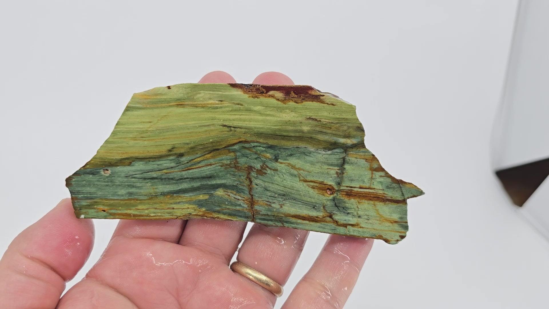 This piece features beautiful green gradations creating natural landscape imagery. The flowing lines and multiple color shades offer exceptional cabbing potential.