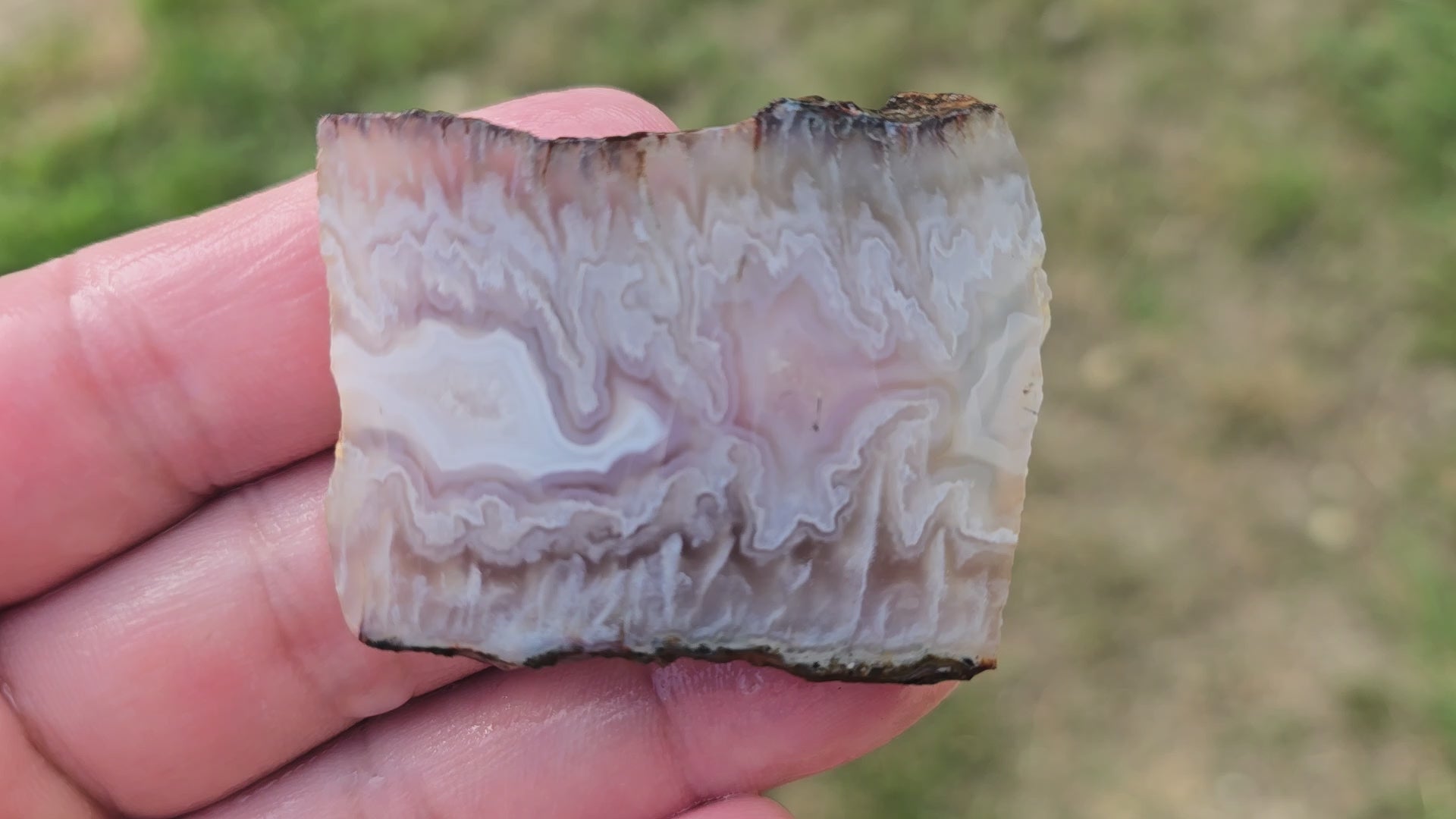 Ghost Seam Agate is seam material from the Sahara Desert of Morocco, collected by nomadic shepherds and prized for its ethereal appearance. This agate features light blue coloration with interesting fortification patterns that create unique visual effects. When cut perpendicular to the seam (like a biscuit), it reveals cloudscape-like scenes. Cut parallel to the seam, it displays fortification that can resemble ghostly figures, giving this stone its distinctive name.