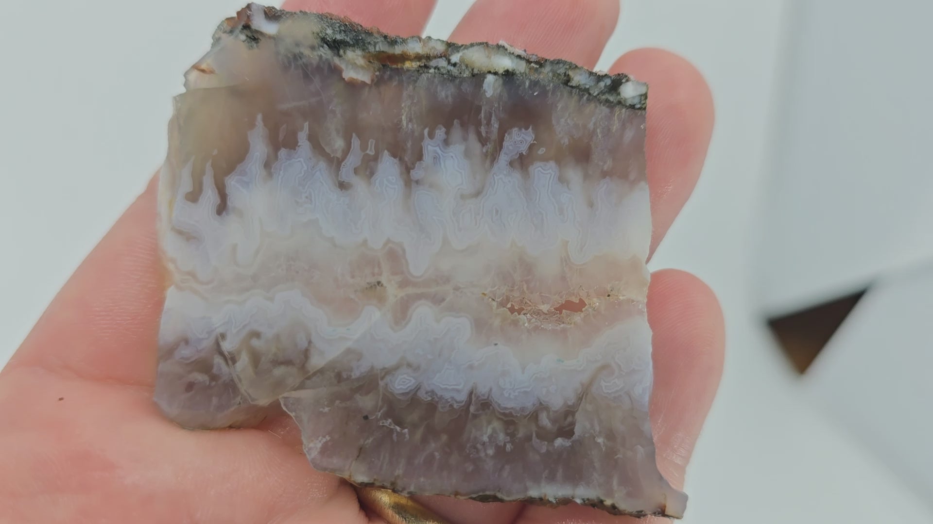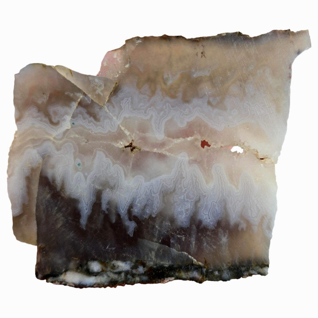 Ghost Seam Agate is seam material from the Sahara Desert of Morocco, collected by nomadic shepherds and prized for its ethereal appearance. This agate features light blue coloration with interesting fortification patterns that create unique visual effects. When cut perpendicular to the seam (like a biscuit), it reveals cloudscape-like scenes. Cut parallel to the seam, it displays fortification that can resemble ghostly figures, giving this stone its distinctive name. The material takes a quality polish and sometimes contains druzy centers that add natural character to finished pieces.