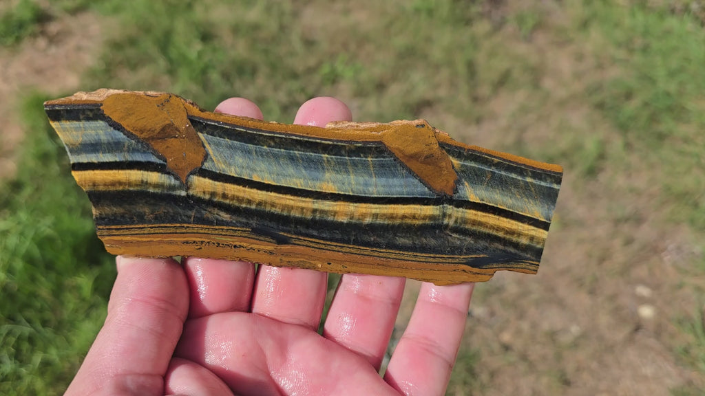 This Hawkeye Tiger Eye slab features rich blue chatoyance and a brilliant golden band running directly through the center. The interplay between the deep blue hawkeye and golden tiger eye zones creates stunning contrast and visual flow—ideal for cutting cabs or showcasing as a natural display.