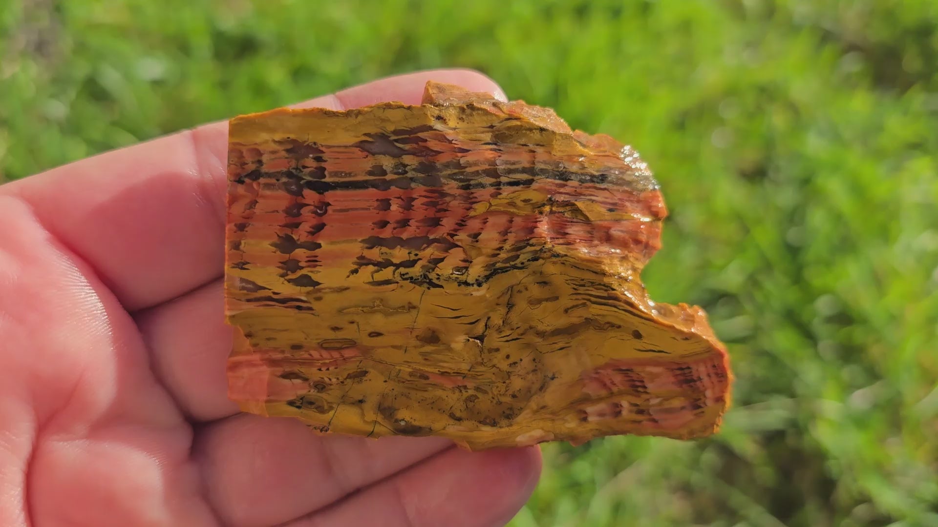 Howardite is a popular material from Nevada known by several names, including Rattlesnake Jasper and Flamingoite, reflecting its diverse appearance. This opalized silicate creates distinctive and attractive cabochons for jewelry and collections. The material is fairly rare, making it worth acquiring when available.
