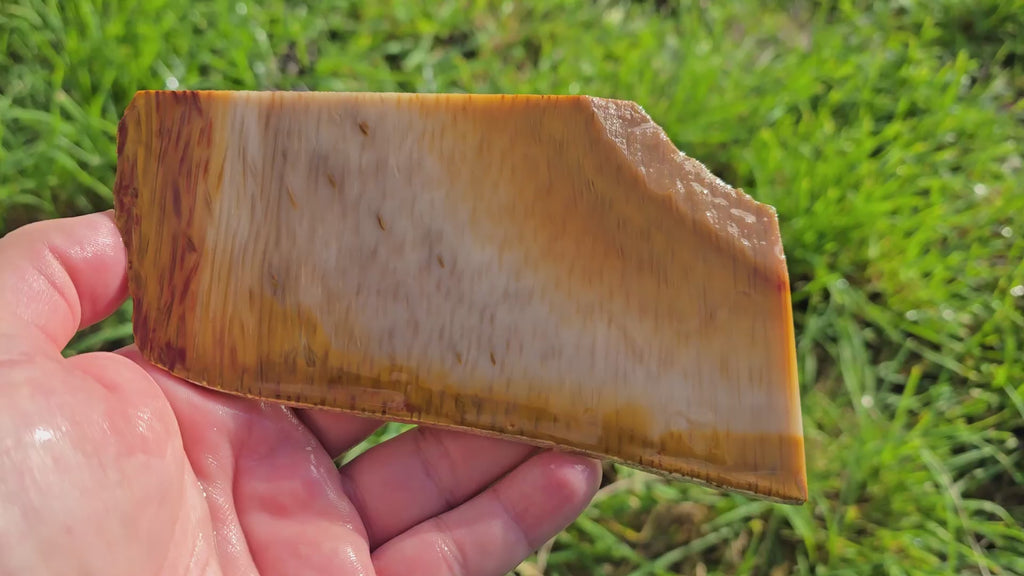 This piece features well-defined palm patterns with beautiful butterscotch tones throughout. The stable composition ensures excellent workability for any lapidary application.