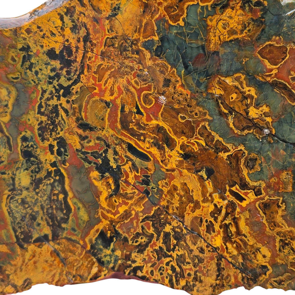 This is a Jurassic variety Kaleidoscope Jasper slab from the Gold Stripe Bed — one of the most iconic zones of the now-depleted Oregon deposit. It features that vibrant color and organic structure that made this discovery legendary among lapidary artists and collectors.
