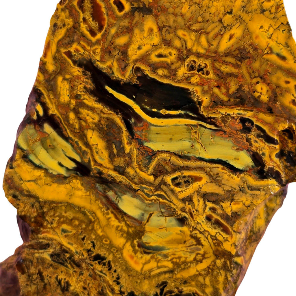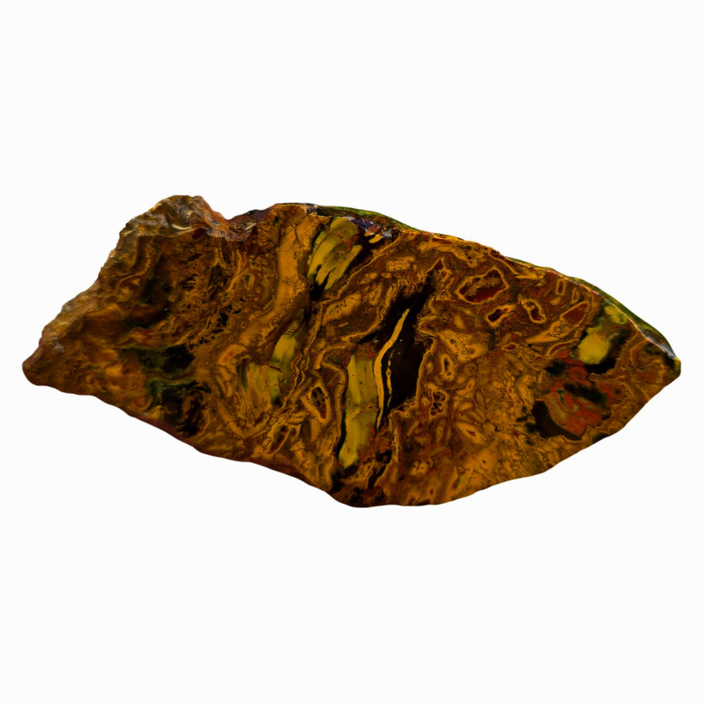 This distinctive Kaleidoscope Jasper slab from the Jurassic deposit features fascinating organic patterns with fossilized bog wood formations creating truly unusual natural artistry. This rare Oregon material will yield one to two exceptional cabochons with patterns unlike anything else in the jasper world. This unique stone should take a quality polish.