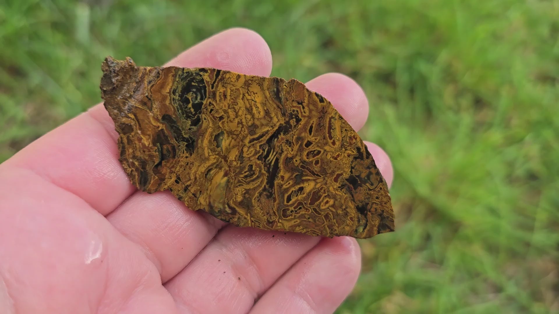 This piece showcases exceptional organic patterns from the Jurassic fossil deposit with bog wood inclusions creating natural designs. The one-of-a-kind formations make this perfect for unusual designer cabochons that stand apart from typical jaspers.