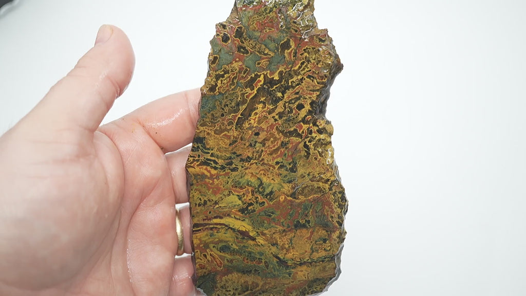This captivating slab from the floating orb deposit showcases the incredible pattern diversity that makes Kaleidoscope one of the most collectible American jaspers. Please view the dry photos as this piece does have some soft spots to work around, or it may need treatment for cabbing. However, the exceptional patterns are well worth the effort, and with how rare this material is becoming, this is one you won't want to miss.