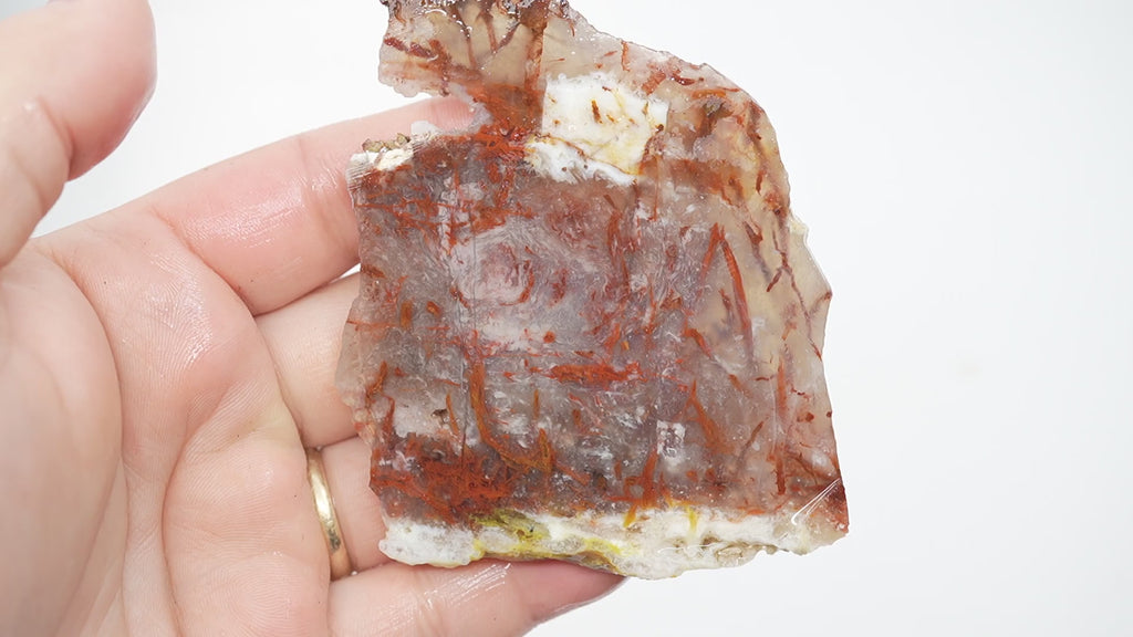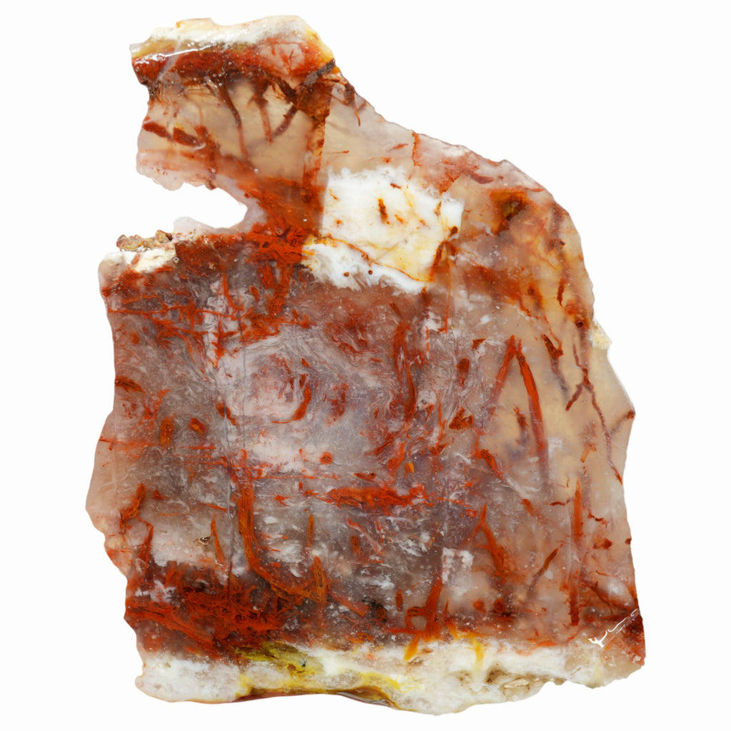 Kramer Hills Agate is a striking and collectible bog agate from near Kramer Junction, California. Known for its vivid red flame-like patterns, soft whites, and translucent agate zones, this material stands out for its fiery contrast and visual depth. Most reaches the market as small tumbling rough, making larger cutter-grade pieces highly sought after.