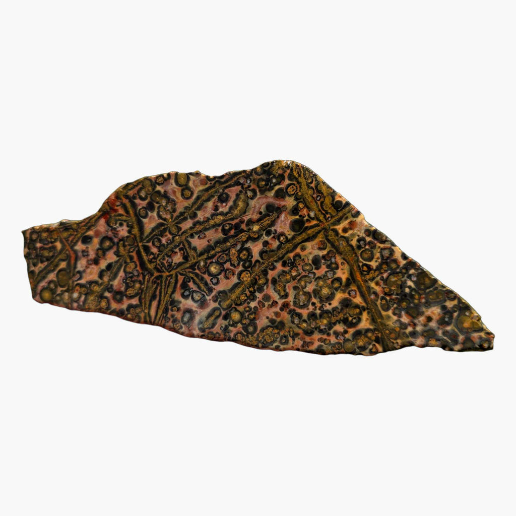 Leopard Skin Rhyolite is a depleted volcanic rock known for its striking orbicular patterns and leopard-like spots. This collectible material features oolitic-like orb structures in a mix of pinks, yellows, blacks, and creams—creating wild, high-contrast designs. It is relatively solid, takes an excellent polish, and has long been a favorite in the lapidary world for cutting bold, eye-catching cabochons. With quality rough becoming harder to find, Leopard Skin Rhyolite remains a unique and sought-after choice for collectors and stone cutters alike.