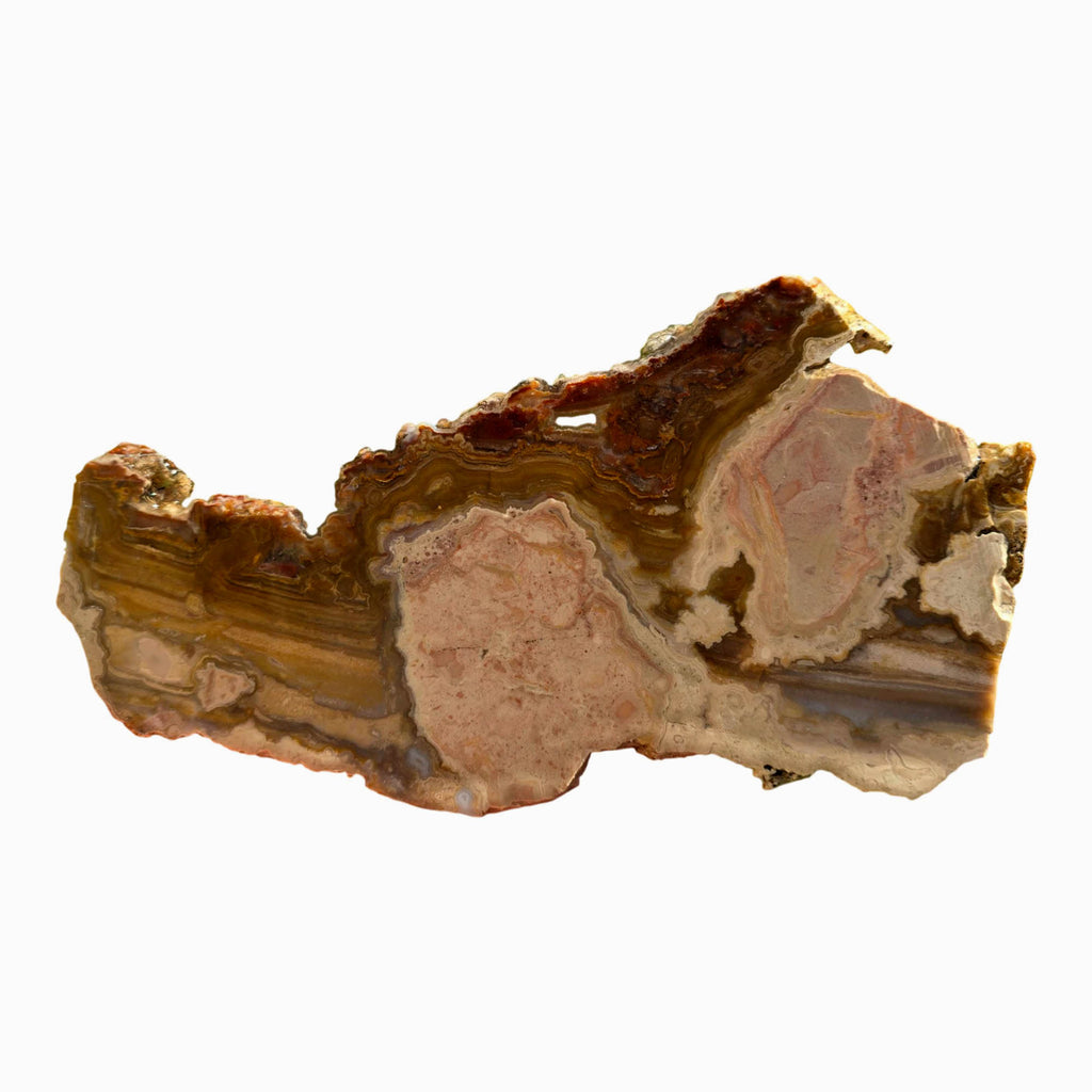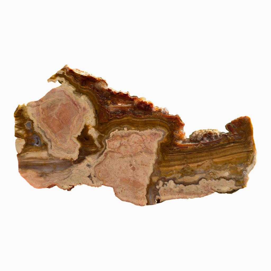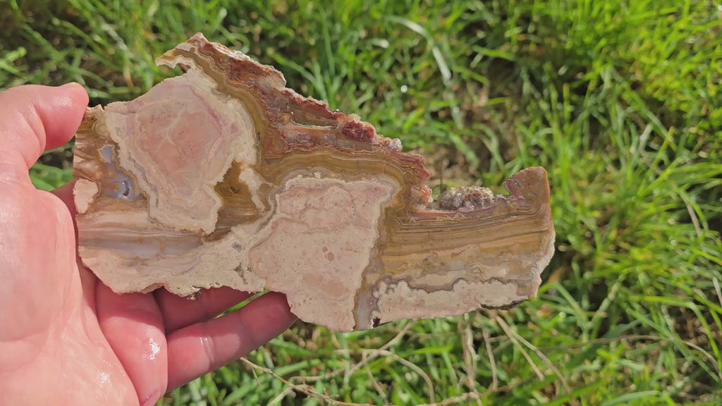 This specimen features exceptional layering with pink agate, delicate lace, and moss formations all in one piece. The large cutting area provides multiple opportunities for high-quality cabochons.