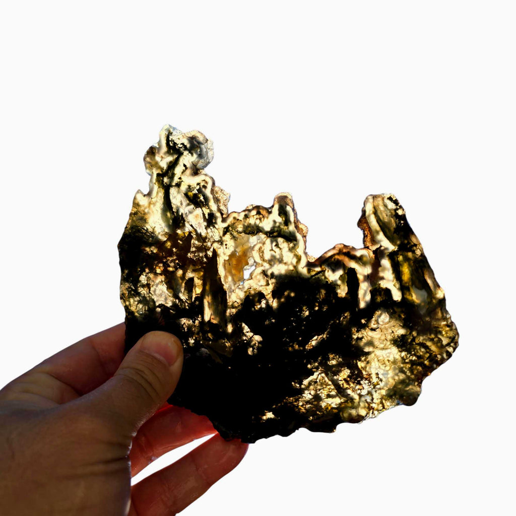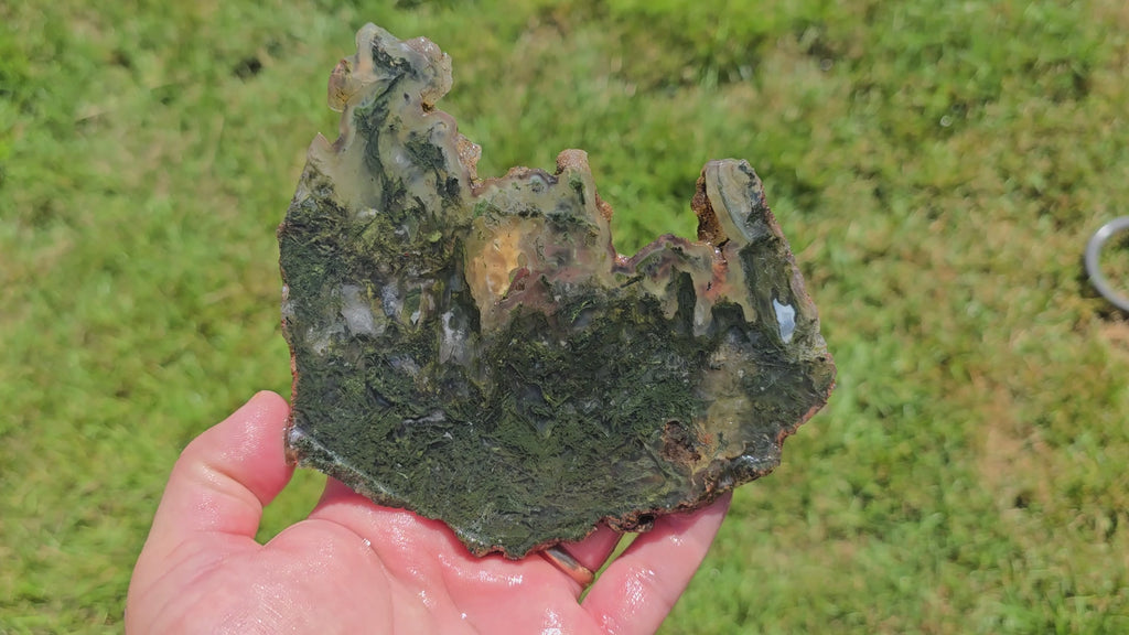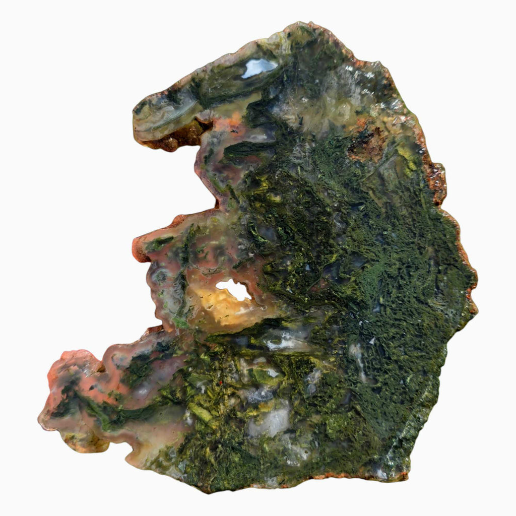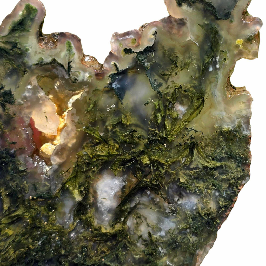 This gorgeous slab of Maury Mountain Moss Agate is packed with character—from its vivid green moss formations to its excellent translucency that makes it a perfect backlit display piece. Along the upper edge, you’ll find botryoidal texture, and there’s a beautiful quartz drusy inclusion with a subtle sparkle. This is a standout example of this classic Oregon agate, with plenty of cutting or display potential.