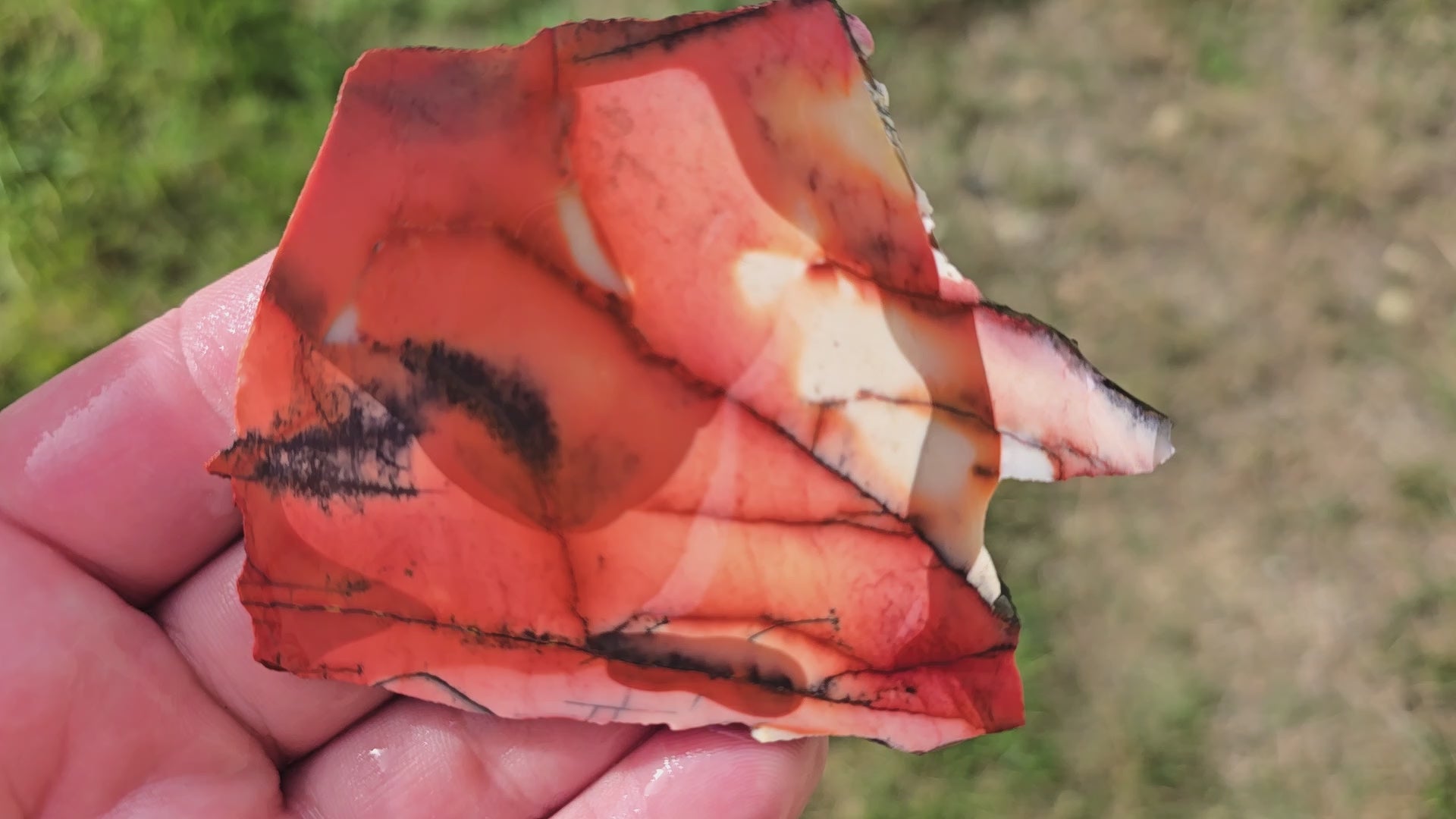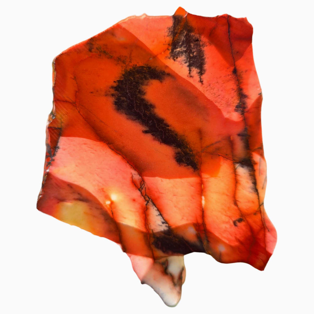 WHAT MAKES IT SPECIAL This piece showcases vibrant red as the dominant color with soft peach and pink transitions. The black dendritic inclusions add dramatic contrast and create a unique scenic appearance perfect for statement cabochons.