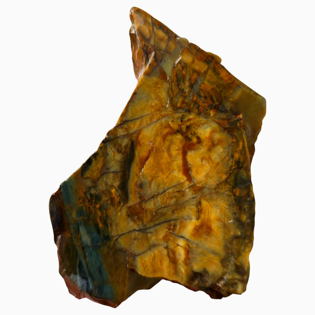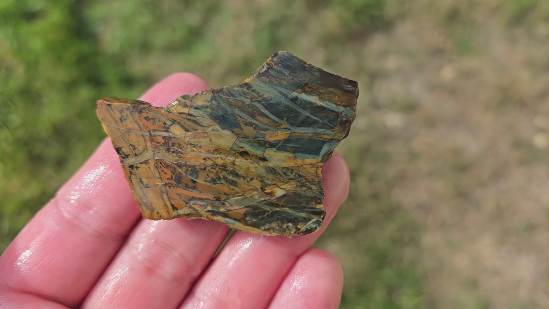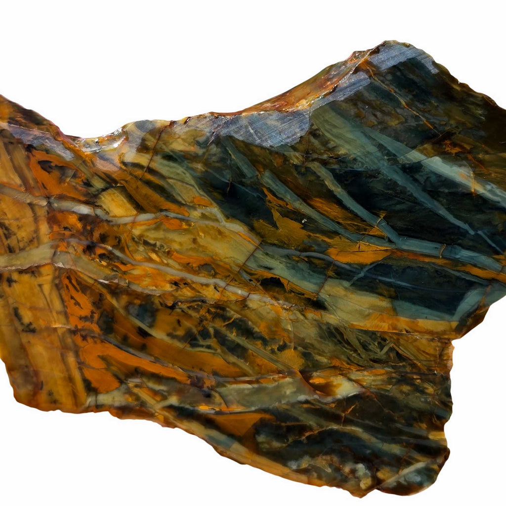WHAT MAKES IT SPECIAL This piece displays brecciated green-blue butterscotch transitioning to dominant butterscotch showing dramatic pattern changes. The thick 8mm cut provides excellent cabochon potential from this holy grail Oregon material.