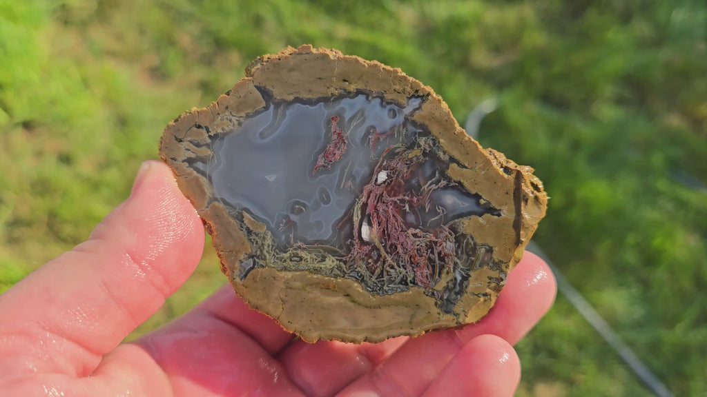 This is a cut and proven Moss Bed Thunderegg showing the rare red and pink moss coloration—the most sought-after variety from this material. At 10 oz, this specimen is unpolished, but its revealed interior clearly demonstrates high-grade moss inclusions. It can be slabbed further for cabbing material or polished as-is for a striking display piece.