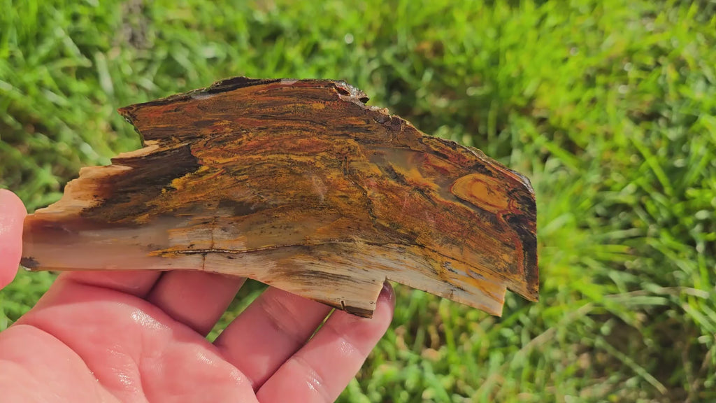 Here's a neat slab of mystery petrified wood from an old estate collection. I personally am not sure where it came from, but most of the material came from Oregon and Washington. This one has great sunset colorations and will make some nice cabochons. Each mystery stone offers the excitement of the unknown combined with quality lapidary material.