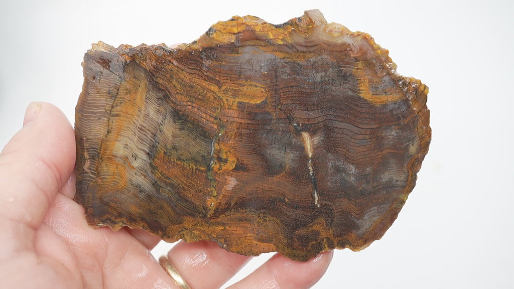 This old stock slab of mystery petrified wood features hematite inclusions and a striking herringbone pattern with rustic orange tones. This is a high-grade slab with exceptional potential that should produce some truly captivating cabochons. The exact origin is unknown, but the quality is undeniable and the cabbing potential is outstanding.