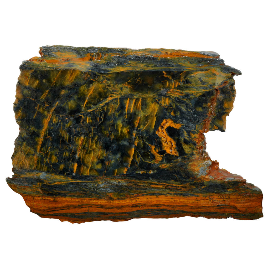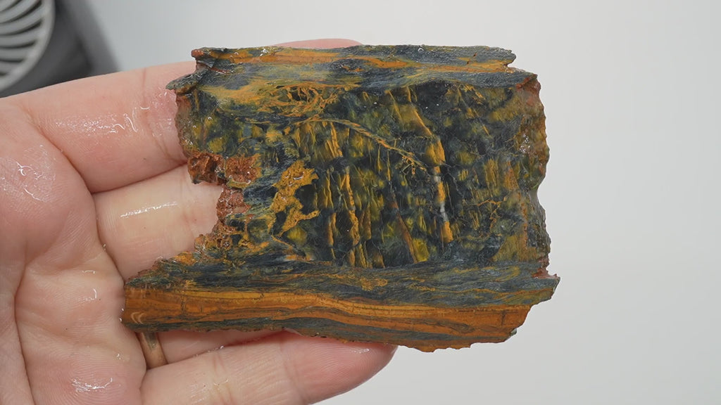 The chatoyant shimmer combined with blue and gold tones gives this slab a pietersite-like appeal at a more accessible price. The hematite accents add further visual contrast and character.