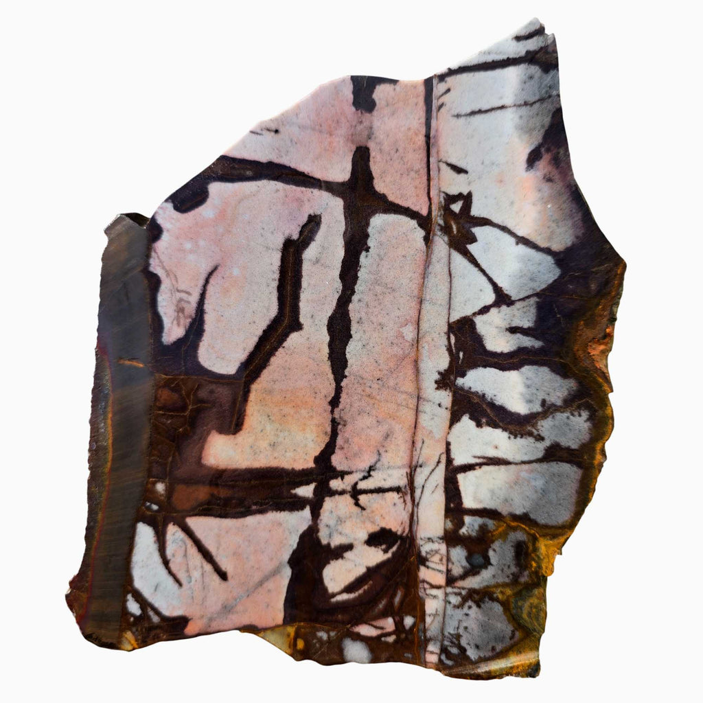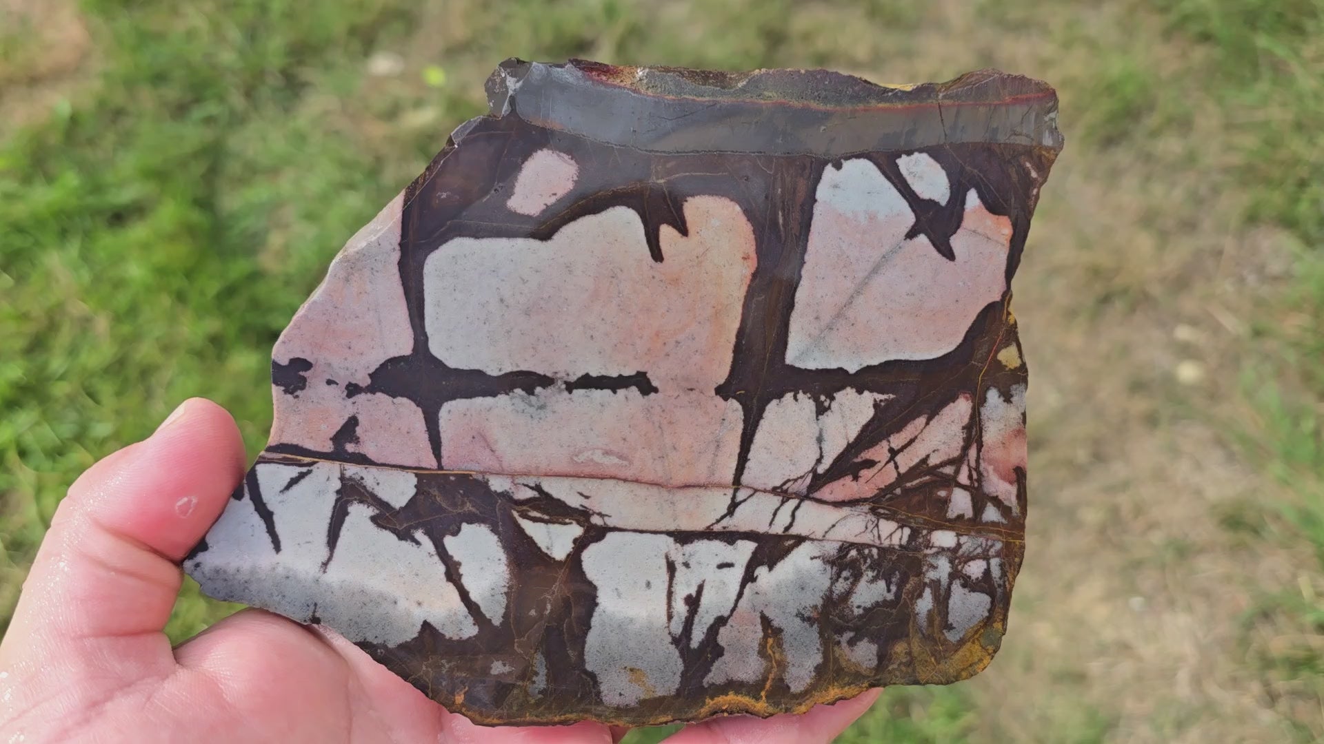 Outback Jasper is a jasper from Western Australia that was a seam jasper located within banded chert layers. It's impressive picturesque jasper, often resembling dendritic jasper with tree-like patterns. It can have a color mix including green, black, brown, white, and even pink creating varied scenes.