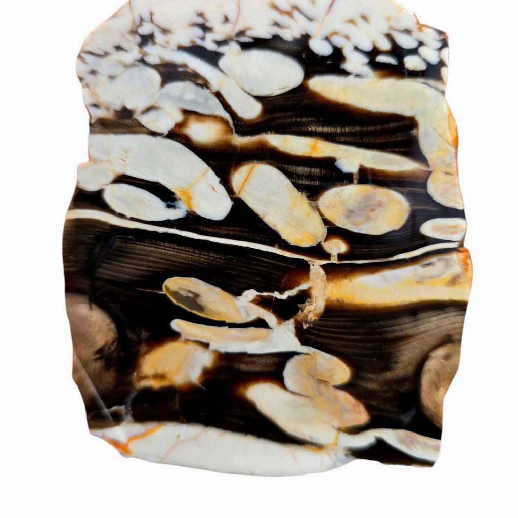 Here’s a rare slab of Peanut Wood — a petrified driftwood from near Carnarvon, Australia that tells an incredible story. Those white “peanut” patterns? They’re actually the fossilized boring tunnels of shipworm larvae (Teredo) that burrowed into the wood during the Cretaceous period before it petrified!