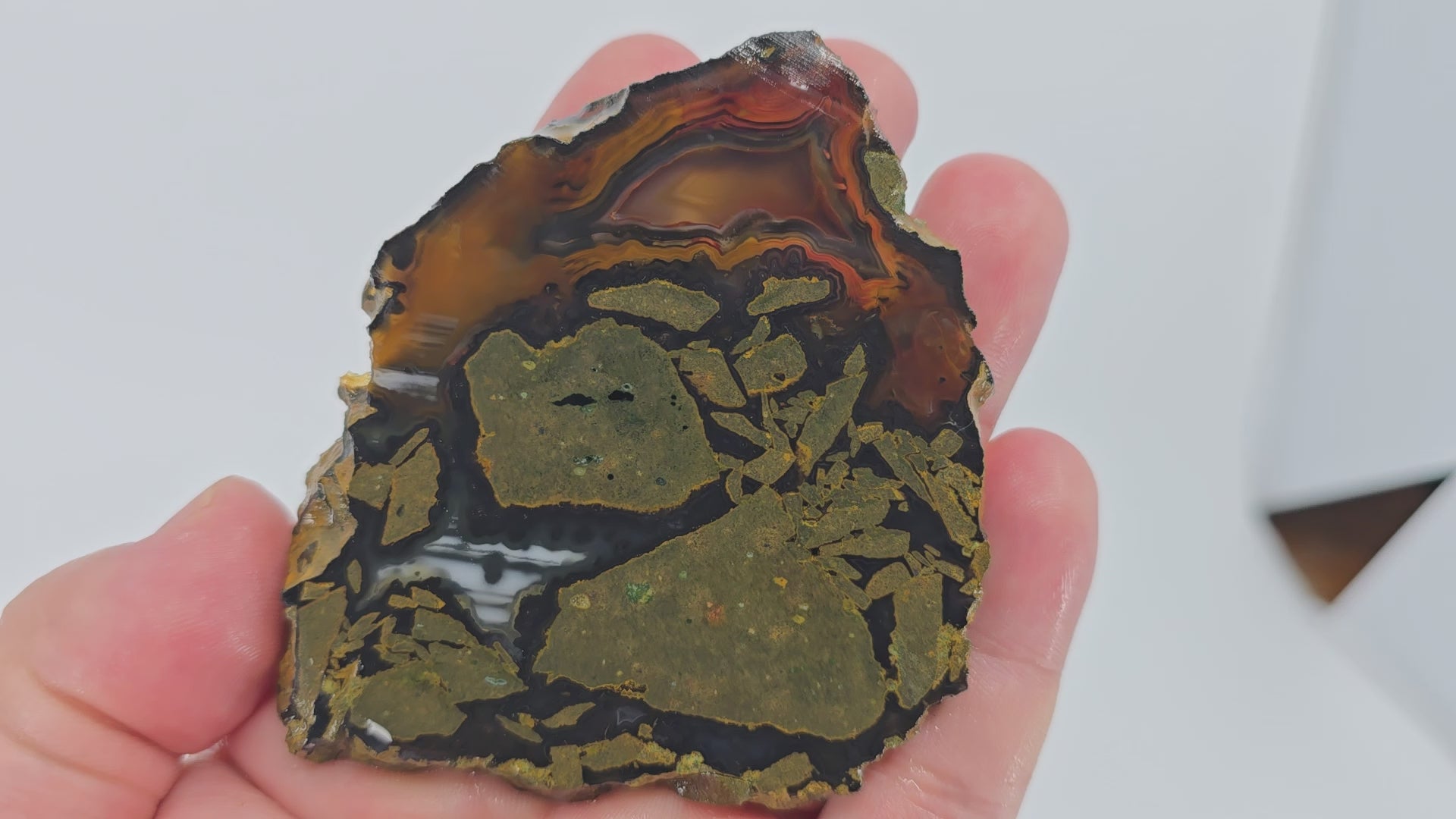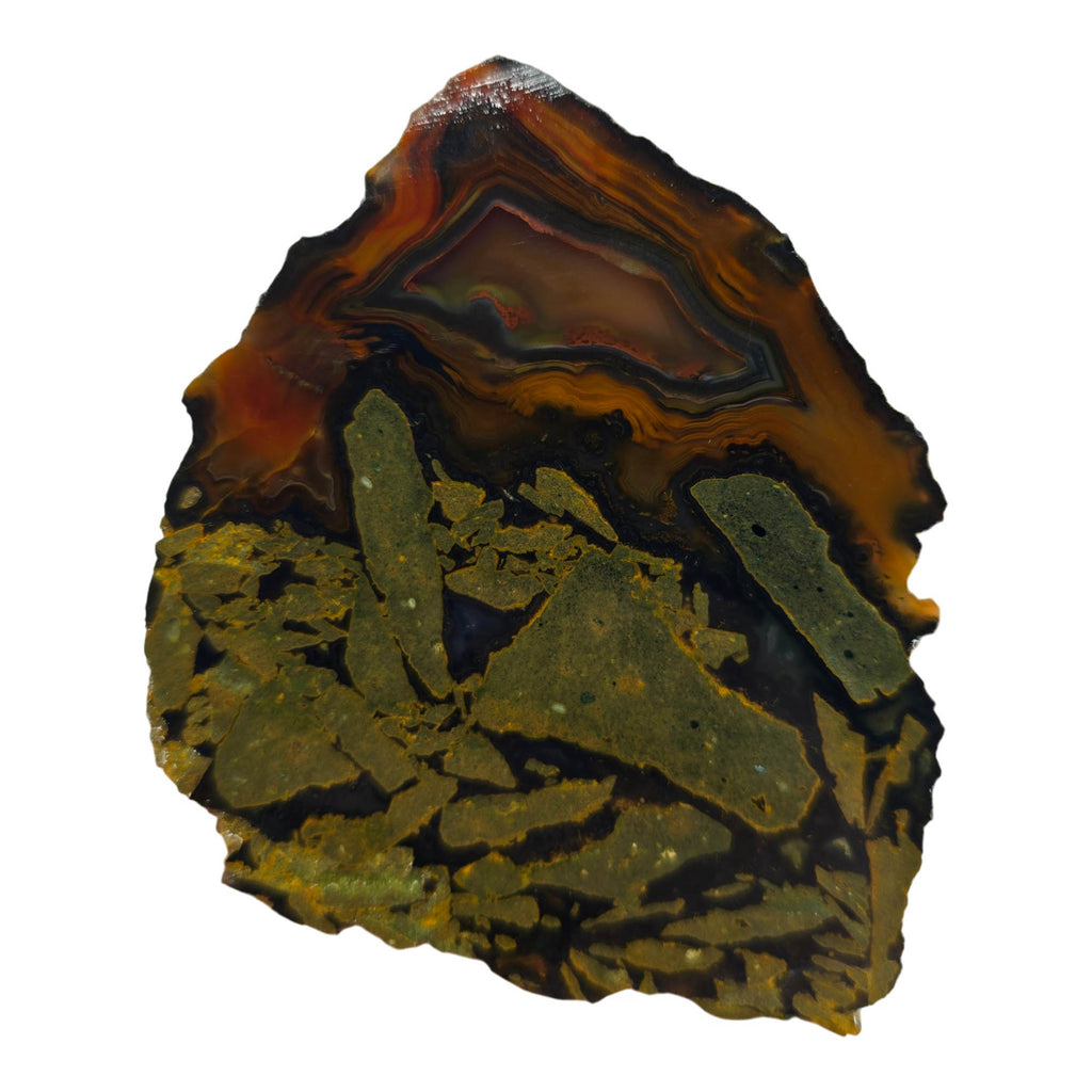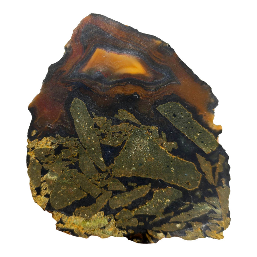 This unique Piranha Agate slab displays orange and red coloration along the top with interesting brecciation and black agate on the bottom half. The brecciated jasper area may need treatment to polish, but this specimen offers unusual composition you rarely see in Brazilian agate. A truly captivating piece that stands out from typical material.