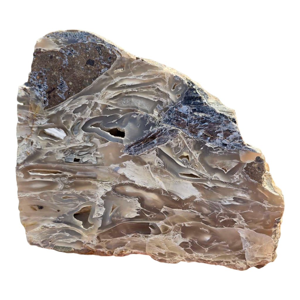 This is an extremely rare, old-stock, polished chunk of Crooked River Limbcast, a fossil agate from Oregon that’s become nearly impossible to find—especially in this large collector size. At 18 lbs, this piece is bursting with character: botryoidal tube formations, partial shrinkwood structures, and exposed outer wood grain textures that give it a natural, prehistoric aesthetic.