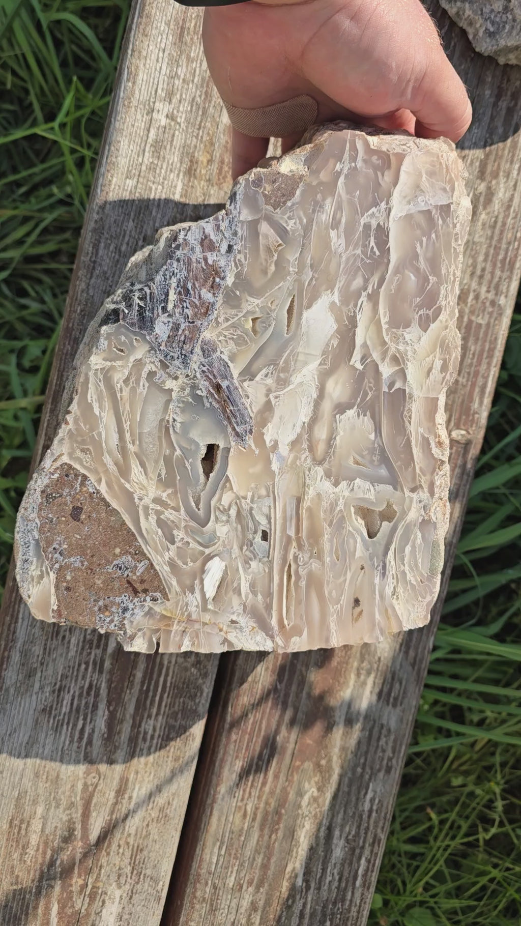 This cut and proven specimen has a polished face, revealing a pattern that strongly resembles Ochoco Tube Agate—so much so, it nearly fooled us! According to its previous owner, the polish may be a spray-on sealer to preserve the surface—but the visual quality remains stunning. Whether you display it or cut it further, this is a true piece of lapidary history.