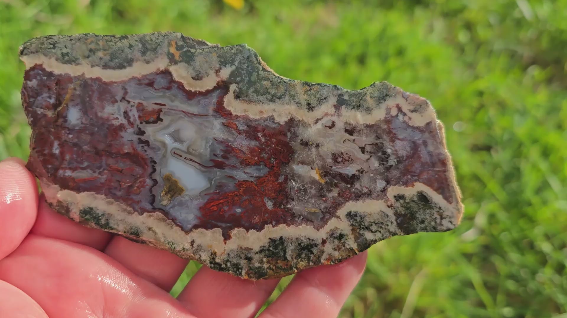 Here's a neat slab of old stock Red Lightning Agate showing great red moss agate this material was known to have. This vintage Mexican classic used to be popular among collectors but has become increasingly rare in today's market. This one should make some nice cabs of this classic material that's rarely seen anymore.