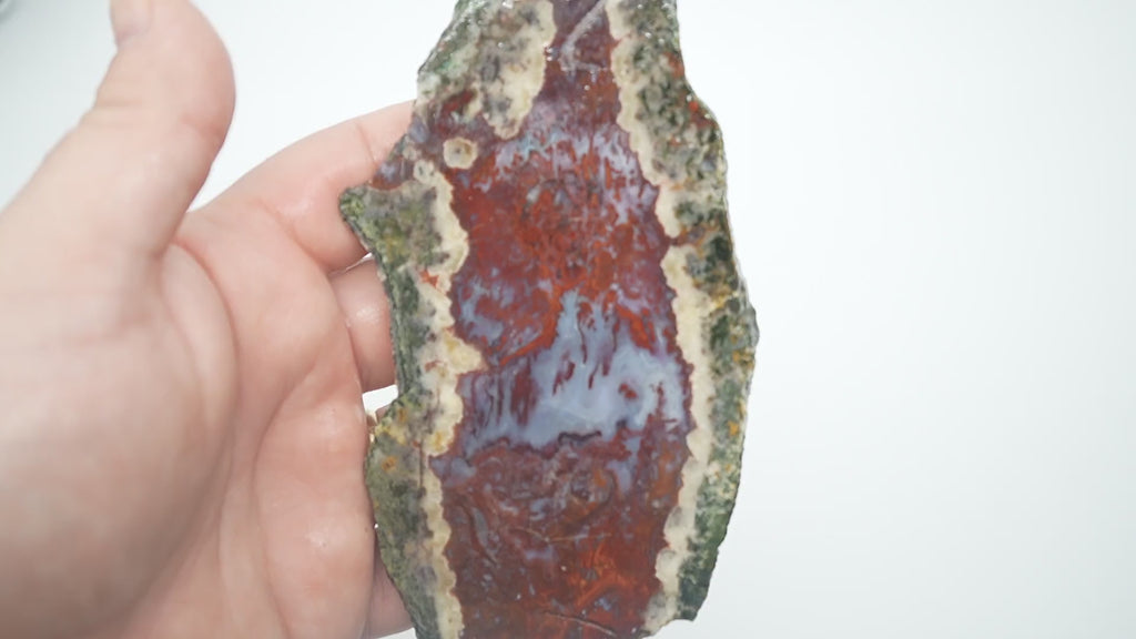 Red Lightning Agate is old stock Mexican material that used to be a classic agate among vintage collectors. Now, with it becoming harder to find, it's material you rarely see as rough or slabs anymore in today's market. It's still nonetheless attractive with unique characteristics. It takes a good polish and often has a mix of bright red moss agate, patches of blue agate, and some unidentified mineral that can run through it similar to that seen in Big Diggins Agate. Red Lightning Agate makes quite captivating cabochons for those lucky enough to find it.