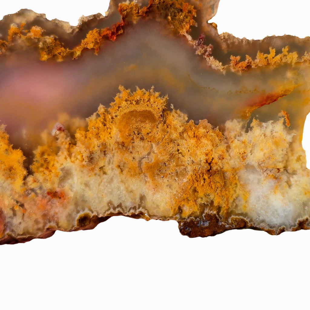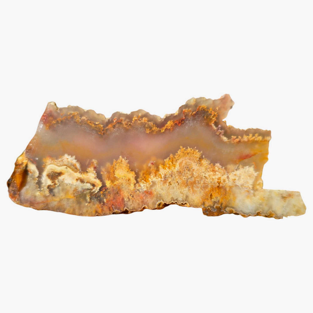 Natural Stone: This is a cut, unpolished slab of genuine Regency Rose Plume Agate. Natural fractures or surface pits may be present as part of the stone’s natural structure.