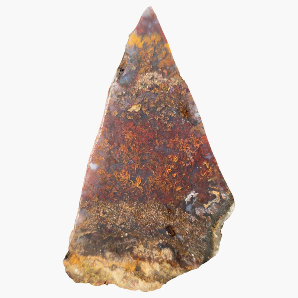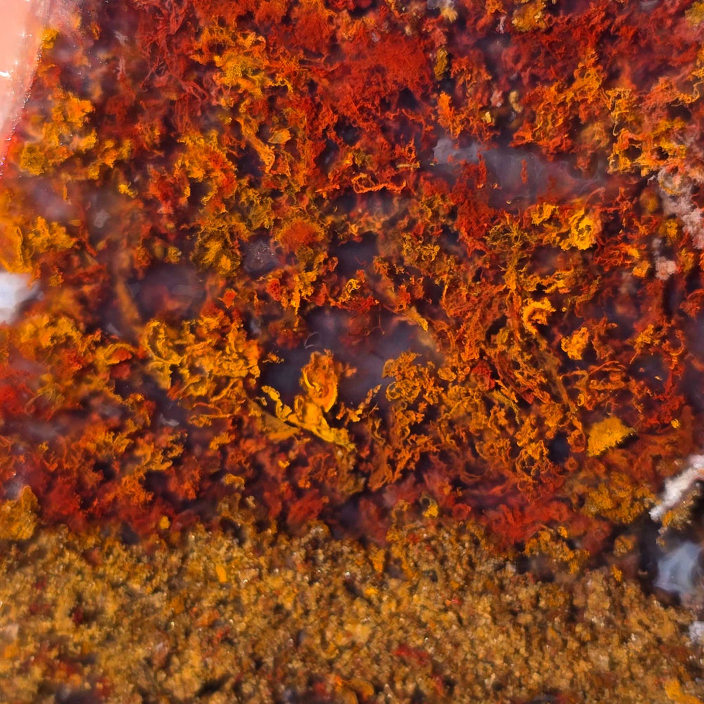 San Carlos Agate is a stunning moss agate from Mexico, known for its bright color and high-contrast patterns. The moss formations range from delicate dendritic structures to bold, flame-like inclusions in hues of red, orange, and gold. It’s a relatively new material in the lapidary world but has quickly gained popularity for its solid cutting quality and dramatic visuals.