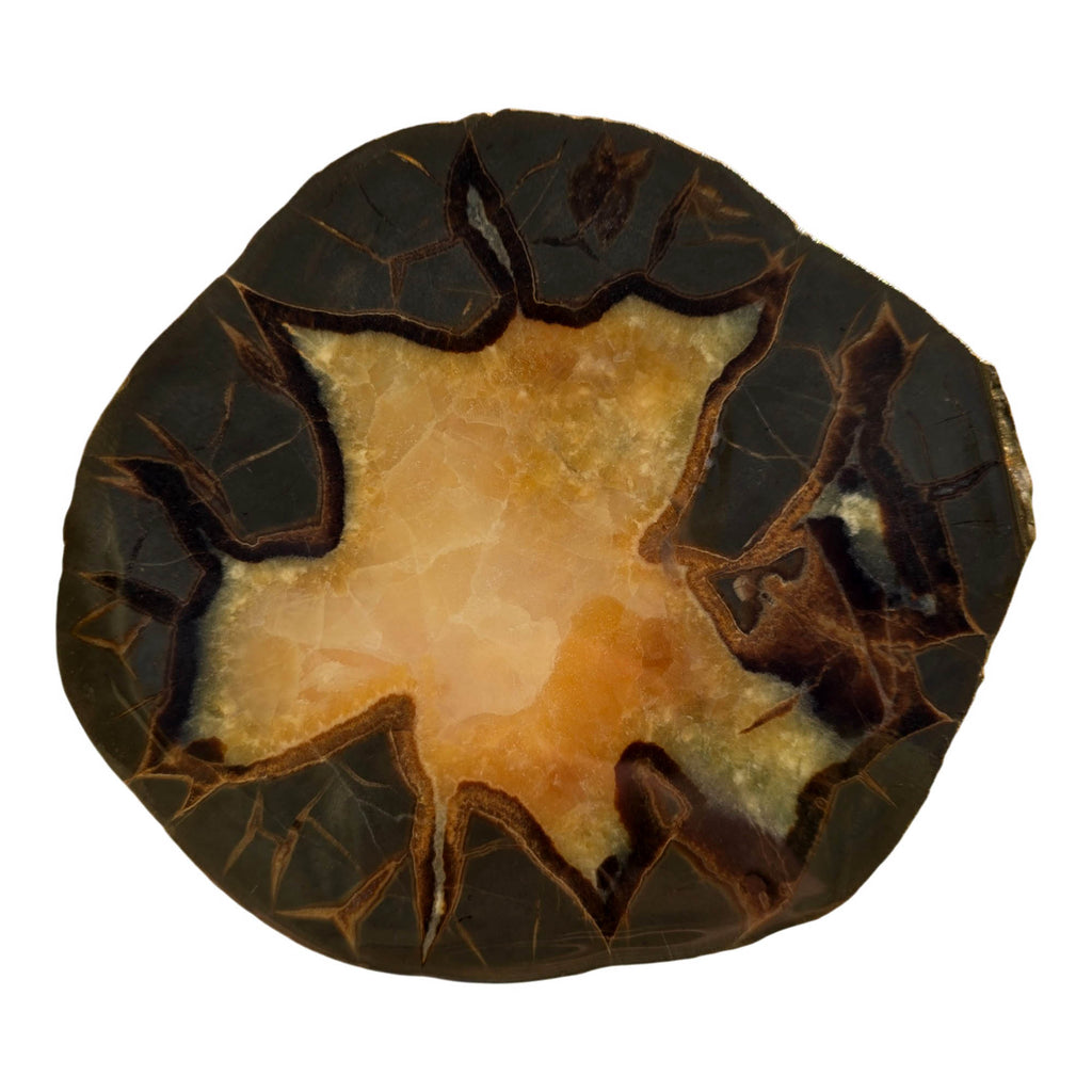 This stunning large slab of Septarian Nodule showcases a gorgeous calcite center framed by a dark calcite outline. Both sides display beautifully, making this an exceptional example of just how remarkable this material can be. The distinctive crackle patterns created by ancient bacterial processes make this a true geological wonder.