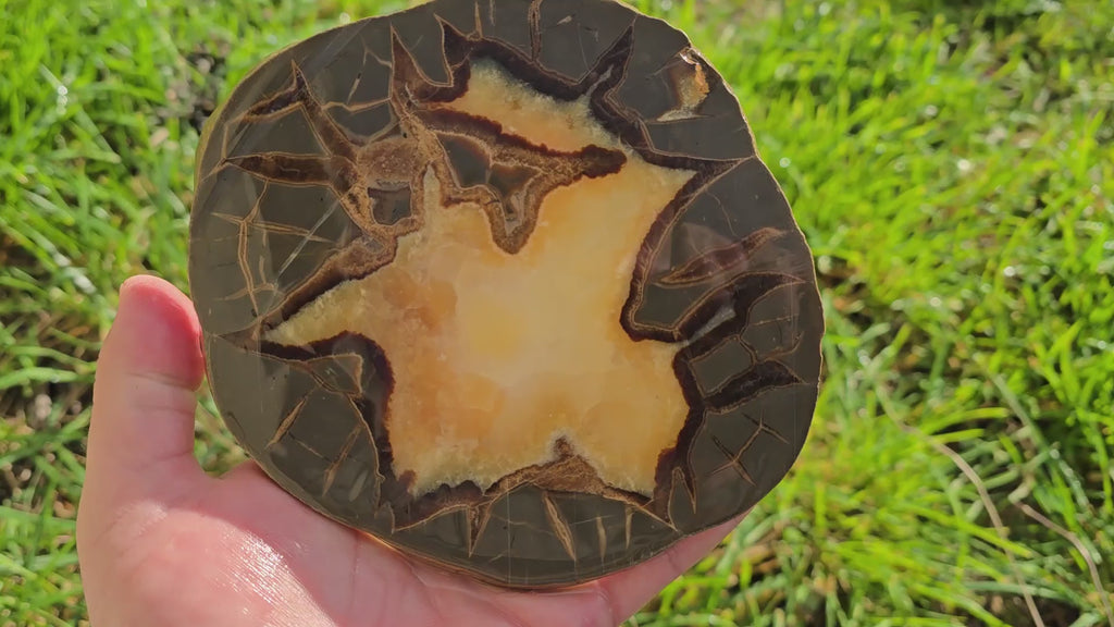 Septarian Nodules are round formations where organic fossils were consumed by bacteria and replaced with calcite, creating distinctive crackle patterns. They can be hollow geodes with calcite crystals or solid with distinctive patterns throughout. Most take an excellent polish and work into quality cabochons or display slabs for collections.